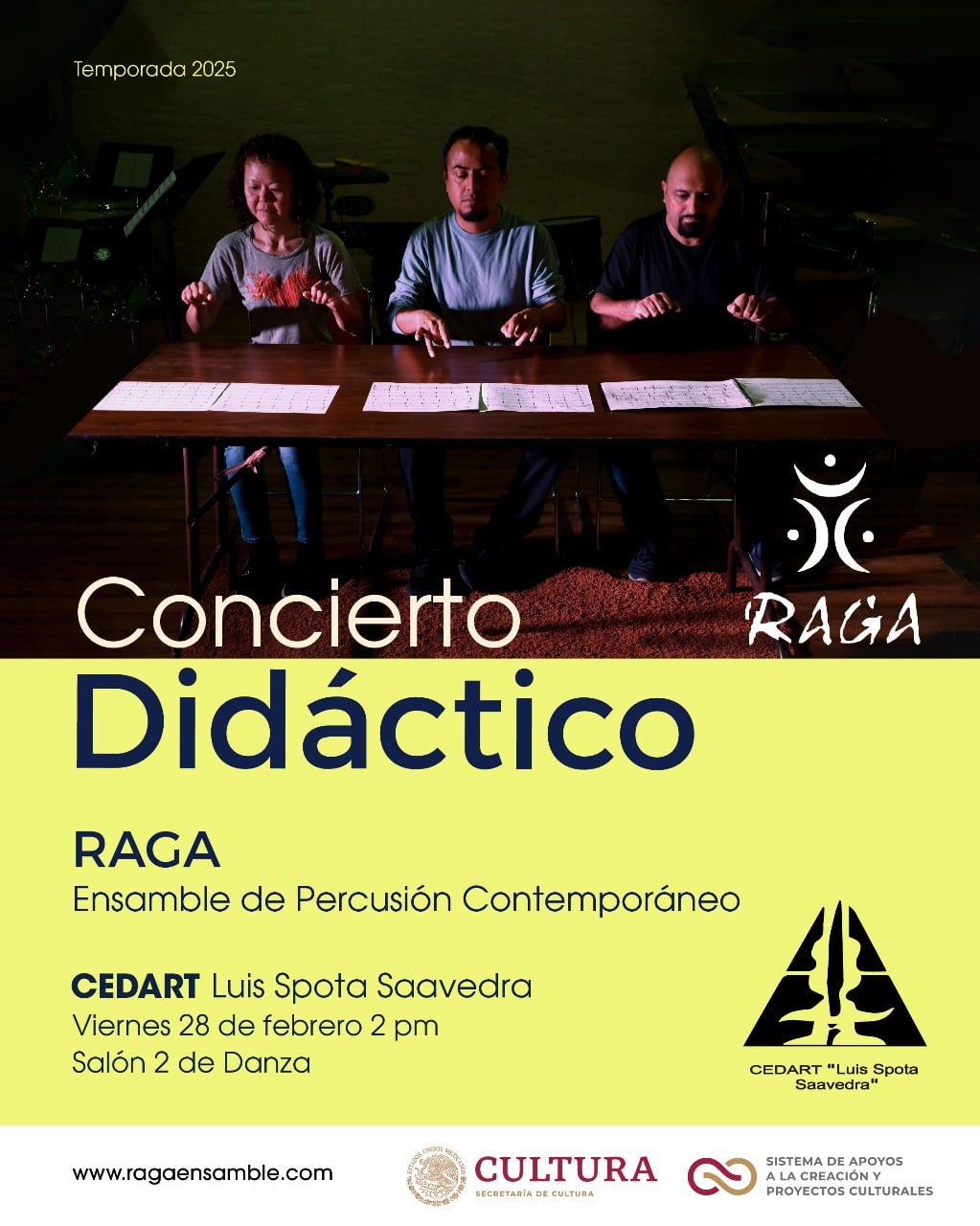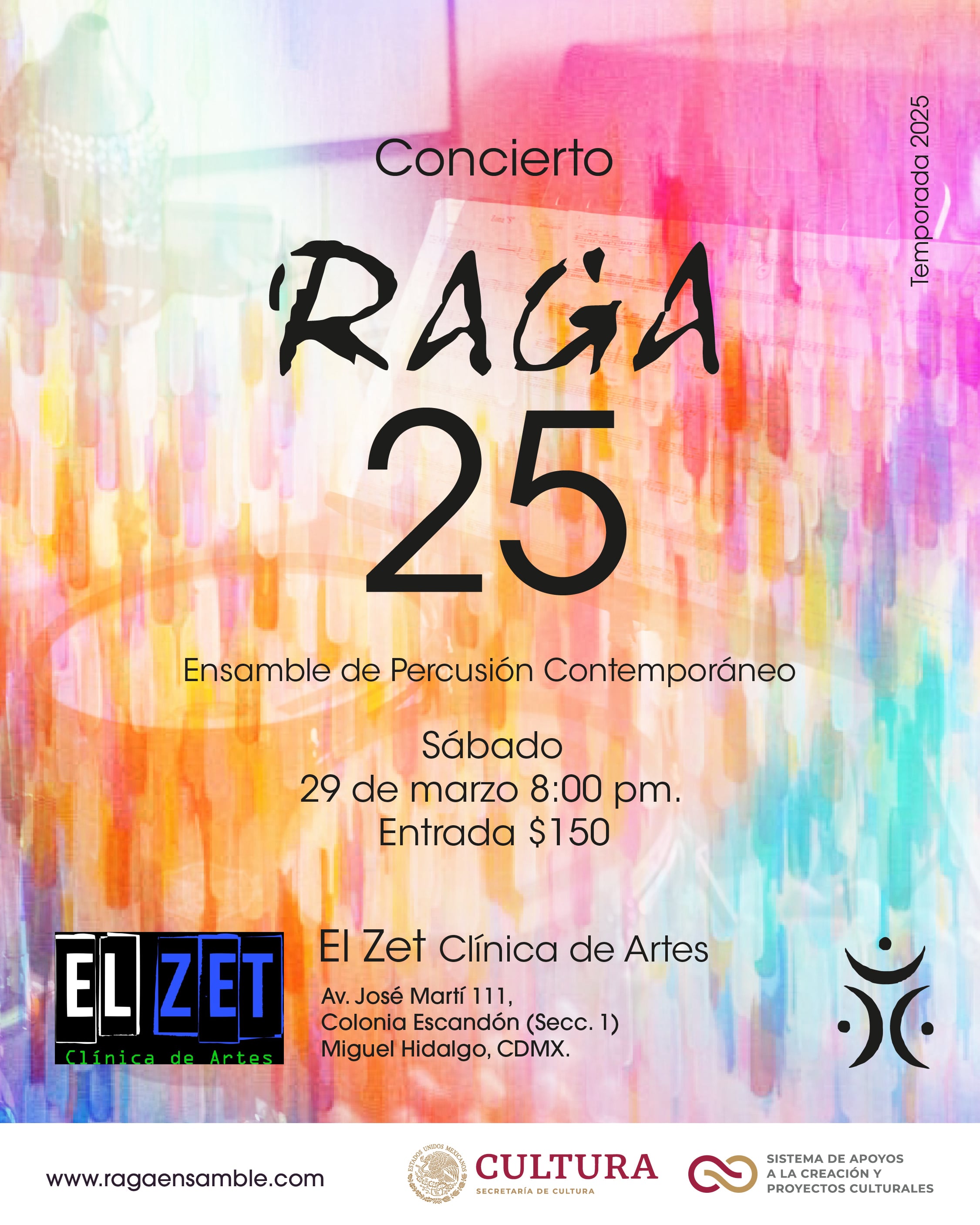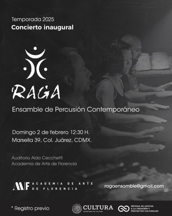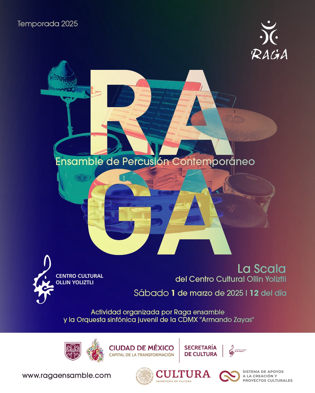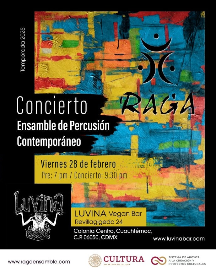 “Este sitio es apoyado por el Sistema de Apoyos a la Creación y Proyectos Culturales”Raga Ensamble de Percusiones de México . 2025 . Todos los derechos reservados.